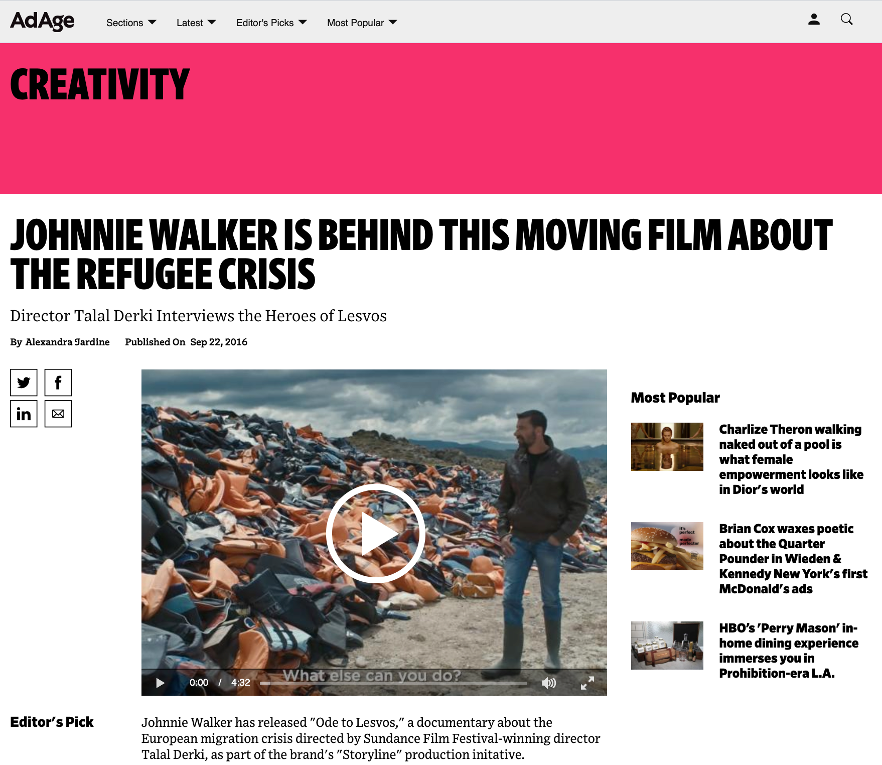 The project was launched on World Peace Day, and what started as a humble documentary spurred massive global conversation. The film was viewed 54 million times. The Guardian picked up the story. Along with Doctors Without Borders, Mercy Corp, and the United Nations. The film was also shown at film festivals across Europe, including Agean Doc, where it was received with a standing ovation, and a request for an encore. It was Awarded a Pencil at the D&AD 2017.